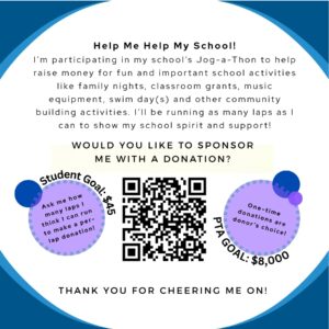 The Jog-A-Thon is the PTA’s largest fundraiser of the year, and your financial contribution will support school shirts, community enrichment activities, swim days and more! The per student goal is $45, or $8,000 altogether.
